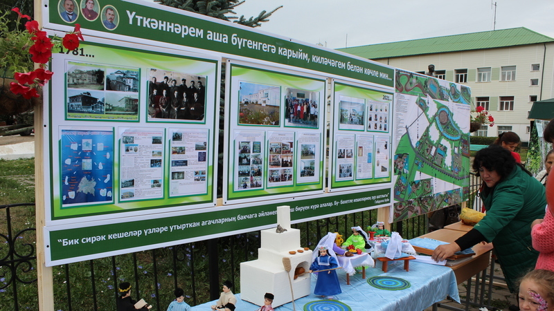 По центральной улице на трех площадках расположились экспозиции, подготовленные образовательными учреждениями района. Школы обратились к истории. Вот раненые в госпитале третьей школы. Школа №2 отмечает нынче свое 100-летие. Поразил жюри шикарный свадебный обряд сарсак-омгинцев. Кадряковцы умело воссоздали быт марийского народа. Пелемешская начальная школа-сад сочинила песню про то, как мы любим Агрыз, на марийском и русском языках. Бимская школа встретила юбилей Агрыза очередными спортивными успехами. Буквально вчера учащиеся Богдан Павлов и Сергей Алмазов привезли золотые медали с республиканских соревнований...