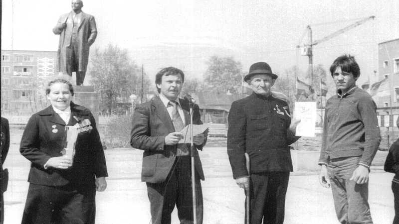 Рафик Шарапов и ветераны комсомола Репина и Шарафутдинов вручают Кубок победителям Эстафеты мира. 1982 г.