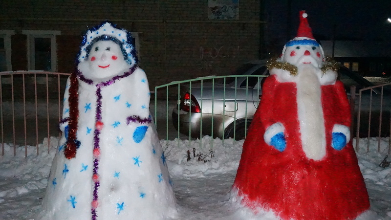Сказочное настроение создаёт украшенная елка, горка для детей, ледовые фигуры деда мороза и снегурочки,а также символ грядущего Нового года.