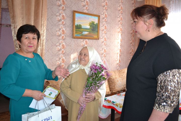 Со знаменательной датой ее пришли поздравить руководитель аппарата Совета Агрызского муниципального района РТ Закирова Резида Амировна и начальник отдела социальной защиты Министерства труда, занятости и социальной защиты РТ в Агрызском муниципальном районе Зарипова Альмира Тахировна.