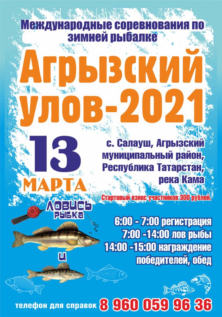 13марта 2021 года на территории с. Салауш Агрызского муниципального района РТна берегу р. Камы пройдут Международные соревнования по зимней рыбалке «Агрызский улов - 2021».