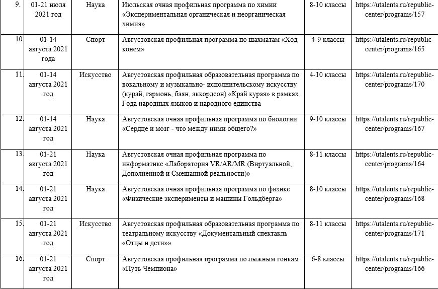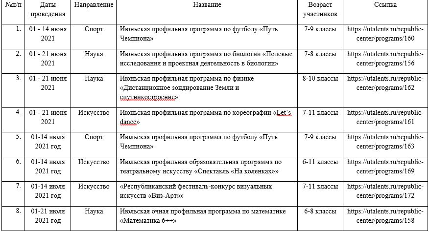 Весь перечень профильных программ, а также информация об отборе и условиях участия представлены на портале Университета Талантов (https://utalents.ru) в разделе Республиканского центра (https://utalents.ru/republic-center).