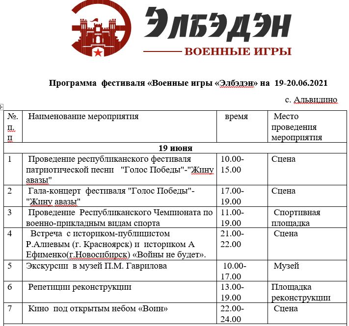 В период с 18 по 20 июня 2021 года на родине героя Советского Союза, легендарного защитника Брестской крепости П.М.Гаврилова в с.Альвидино Пестречинского района Республики Татарстан в третий раз пройдет фестиваль исторической реконструкции «Военные игры «Элбэдэн» (далее – Фестиваль), посвященный памяти героя.