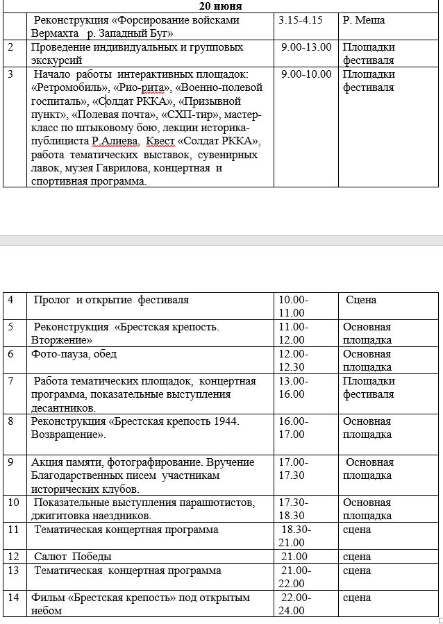 На Фестивале будут воссозданы три реконструкции: «Форсирование войсками Вермахта р.Западный Буг», «Брестская крепость. Вторжение» и «Брестская крепость. 1944. Возвращение». В фестивале планируется участие около 10 000 гостей, более 250 реконструкторов из военно-исторических клубов России и Республики Беларусь, 30 единиц военной техники, авиация.