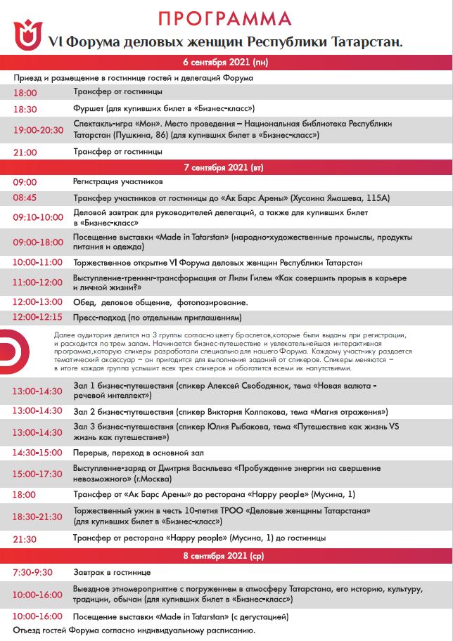 6 - 8 сентября 2021 года в Казани состоится VI форум деловых женщин Республики Татарстан «Работа в кайф» (далее – Форум), организатором выступает Татарстанская региональная общественная организация «Деловые женщины Татарстана». Разработана авторская программа бизнес-тренинга, приглашены лучшие мотивационные спикеры страны, предполагается знакомство с традициями Татарстана, его культурой и историей.