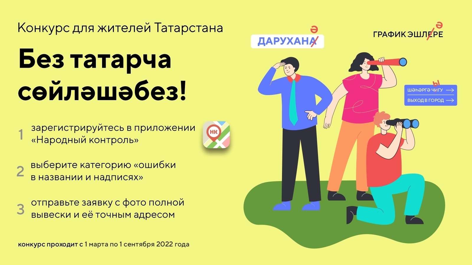 С 1 марта по 1 сентября 2022 года проводится конкурс по привлечению жителей Республики Татарстан к выявлению ошибок в названиях и надписях на татарском языке на вывесках, информационных табличках, топографических обозначениях, дорожных указателях и аншлагах жилых домов на базе государственной информационной системы Республики Татарстан «Народный контроль» (далее –Конкурс).
