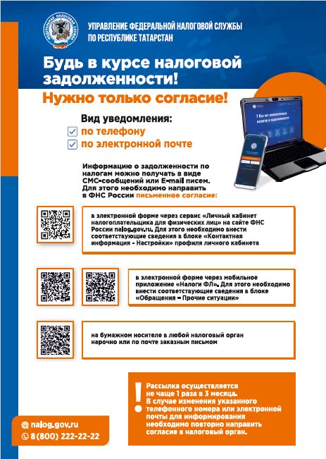 Дав свое согласие на информирование, налогоплательщик сможет получать информацию о задолженности по налогам в виде СМС-сообщений на телефон или E-mail писем на электронную почту. Рассылка осуществляется не чаще 1 раза в 3 месяца.