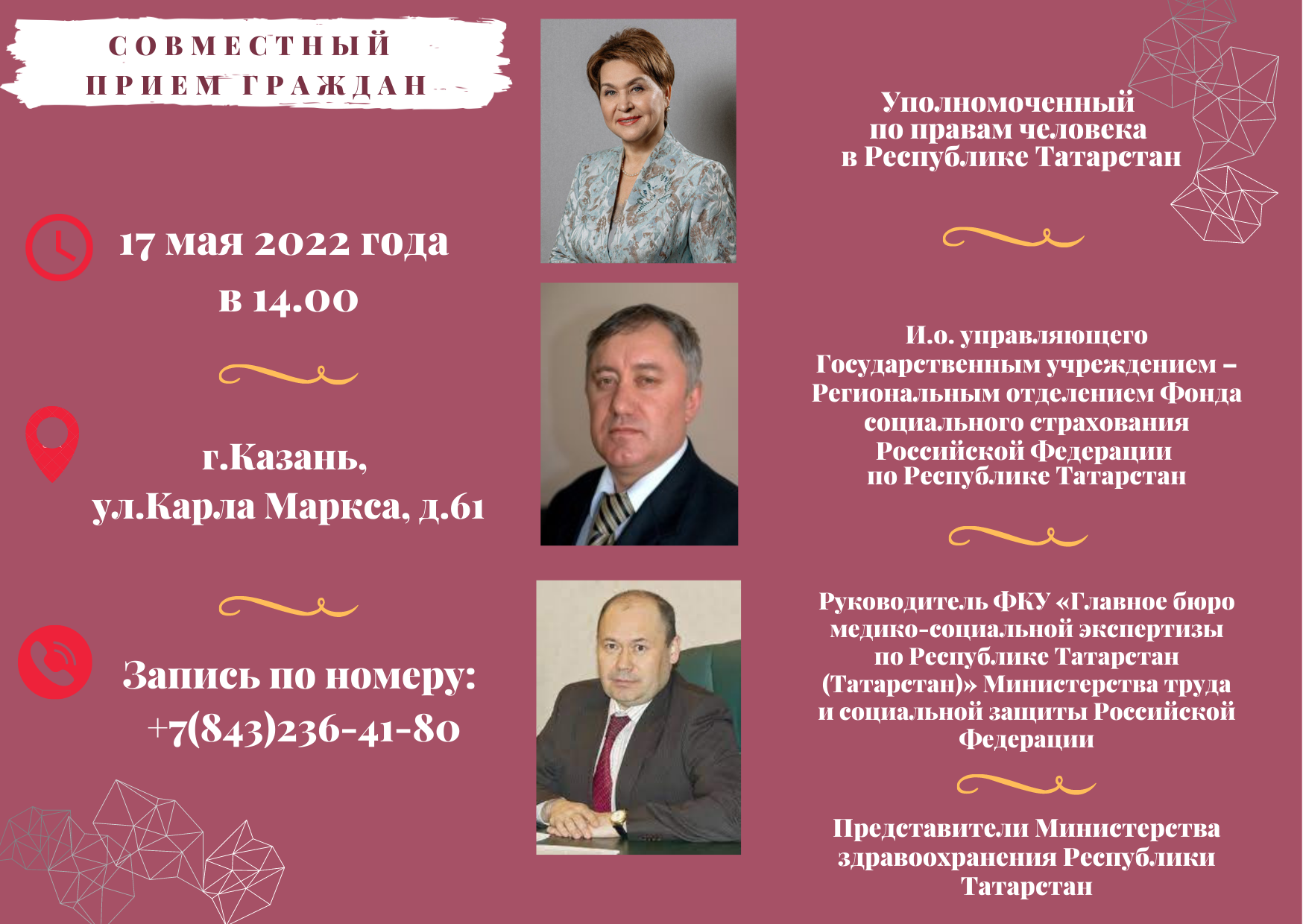 В 2022 году Уполномоченным по правам человека в Республике Татарстан продолжается практика совместных приемов граждан с руководителями государственных органов. 17 мая 2022 года с 14.00 до 16.00 в Аппарате Уполномоченного по правам человека в Республике Татарстан (г. Казань, ул. Карла Маркса, д. 61) состоится совместный прием граждан Уполномоченным по правам человека в Республике Татарстан и представителями руководства Министерства здравоохранения Республики Татарстан, ГУ «Региональное отделение Фонда социального страхования Российской Федерации по Республике Татарстан», ФКУ «Главное бюро медико-социальной экспертизы по Республике Татарстан (Татарстан)» Министерства труда и социальной защиты Российской Федерации.