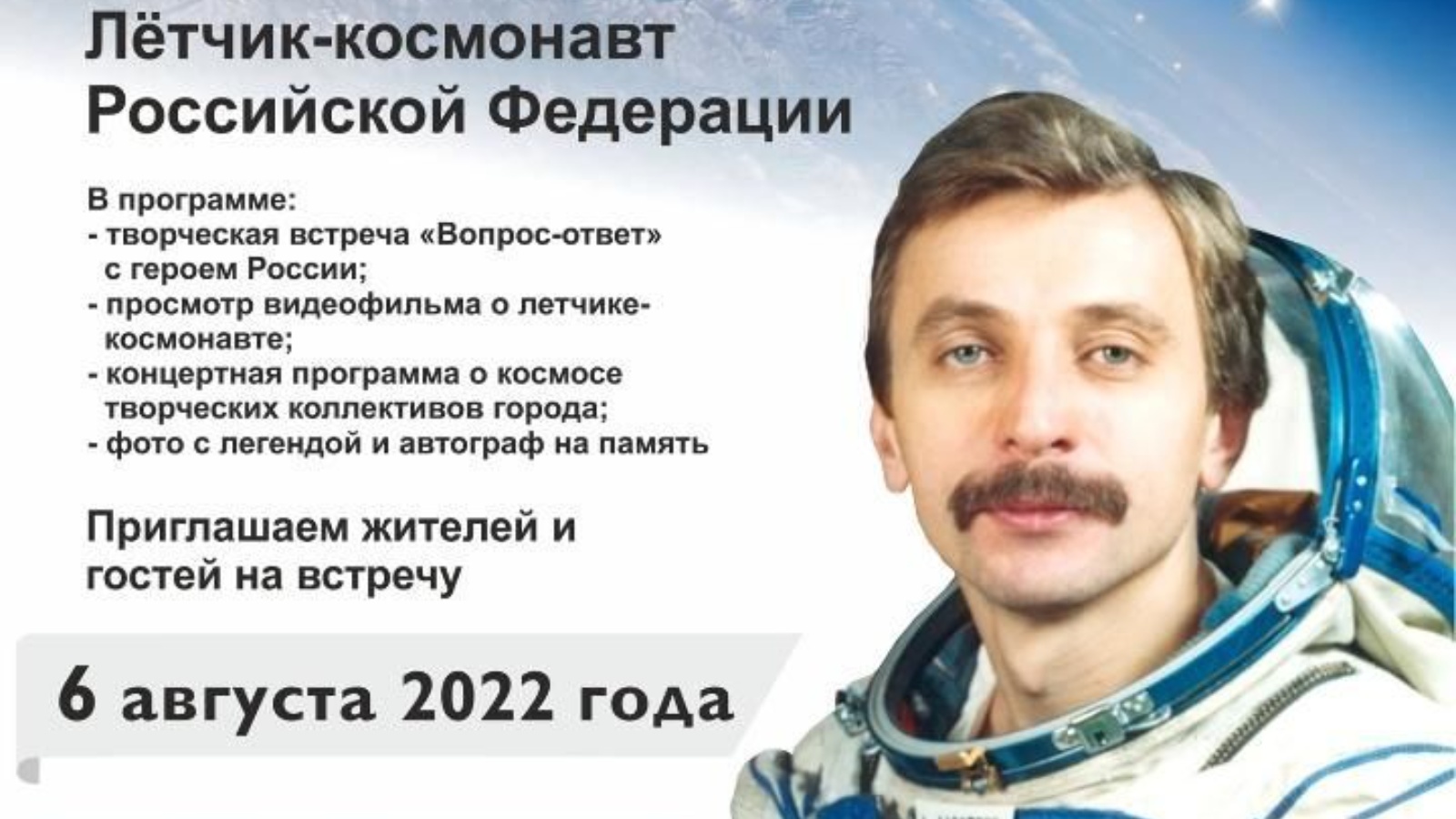 В программе встречи запланирована беседа в формате "Вопрос-ответ", просмотр фильма о летчике-космонавте, концертная программа творческих коллективов о космосе, фото с легендой и автограф на память.