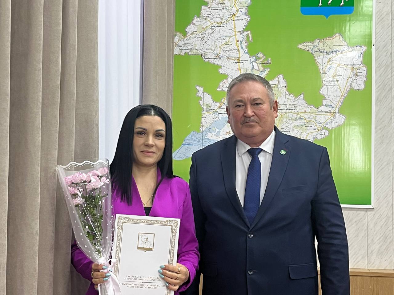 Благодарственным письмом Главы Агрызского муниципального района Республики Татарстан награждается воспитатель детского сада № 8 города Агрыза Гиззатуллина Эльвира Дарселевна, занявшая 3 место в республиканском профессиональном конкурсе «Воспитатель года России-2025» в номинации «Воспитатель группы с родным языком воспитания и обучения»