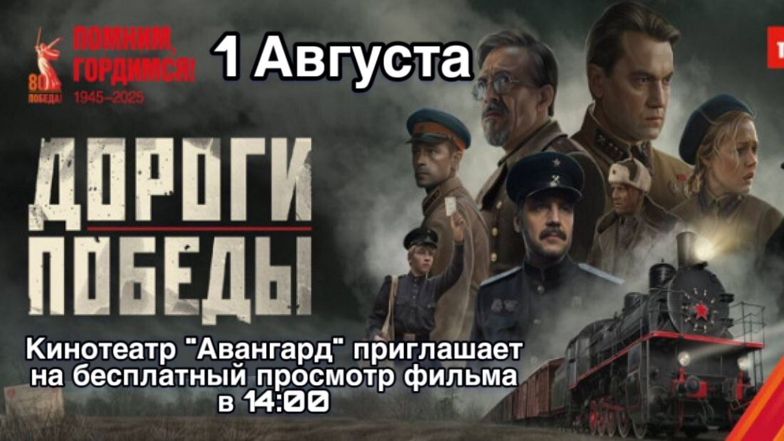 Приглашаем агрызцев в кинотеатр «Авангард» на бесплатный показ художественного фильма «Дороги Победы» о героях-железнодорожниках . Фильм приурочен к 80-летию Победы в Великой Отечественной войне, Году железнодорожной славы в ОАО «РЖД» и Дню железнодорожника.