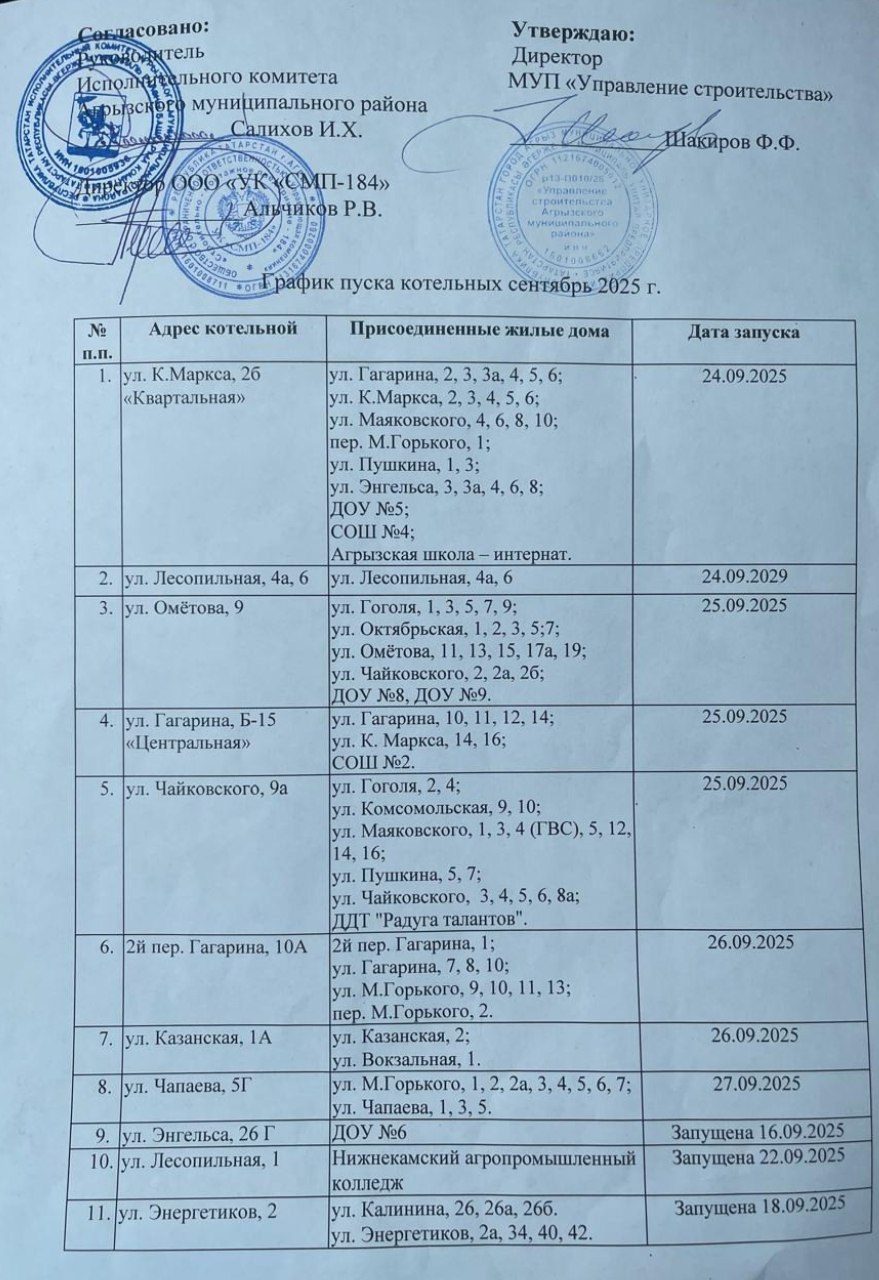 В Агрызе стартовал отопительный сезон. Теплоснабжающая организация МУП «Управление строительства» подготовила актуальный график включения котельных и подачи тепла в жилые дома города.
