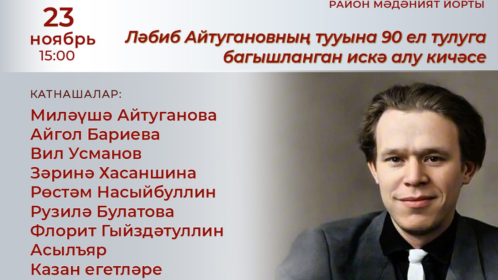 23 ноября в 15:00 в районном доме культуры пройдет творческий вечер памяти нашего талантливого земляка. В нем примут участие дочь поэта Миляуша Айтуганова и известные артисты татарской эстрады. Приходите с семьями и вы! Вход свободный.