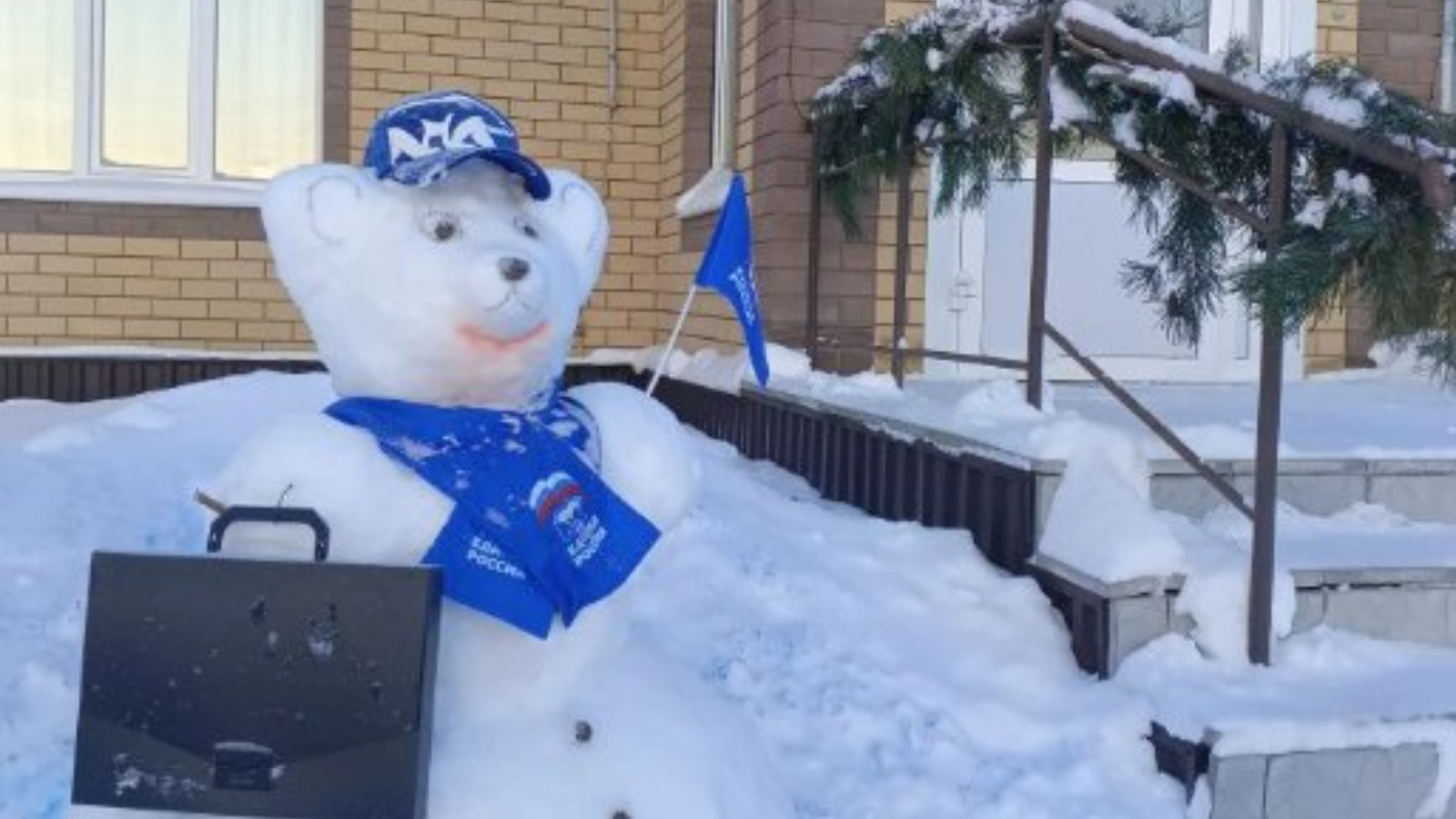 Снеговик-мишка от местного отделения партии «Единая Россия» радушно встречает посетителей: дарит праздничное настроение и поздравляет с наступающими праздниками!