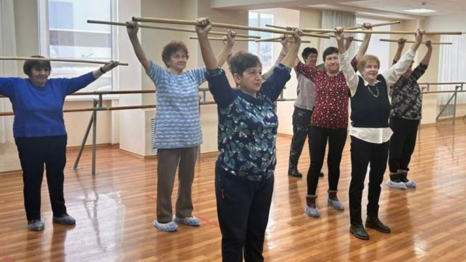 Особое внимание на таких встречах уделяется упражнениям с гимнастической палкой. Благодаря палке движения становятся более осознанными: она служит естественным ограничителем и ориентиром, помогая сохранять правильное положение тела и избегать лишних отклонений.