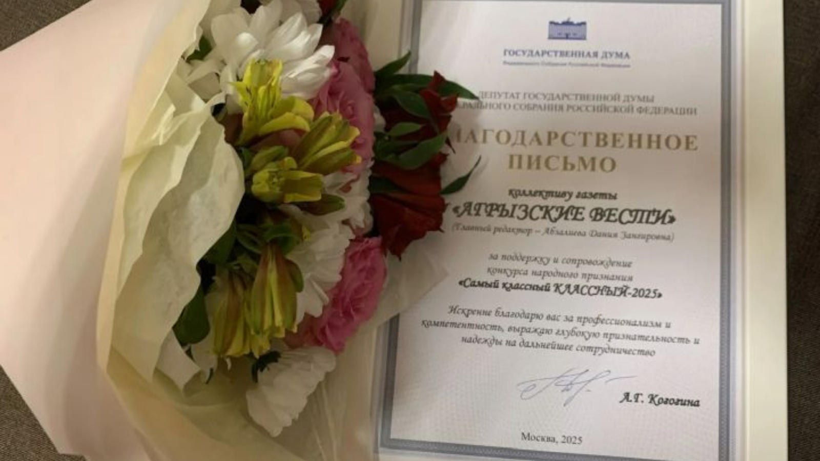 Коллектив газеты "Агрызские вести" награжден Благодарственным письмом депутата Государственной Думы Альфии Когогиной за информационную поддержку и сопровождение конкурса народного признания "Самый классный КЛАССНЫЙ-2025".