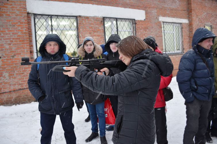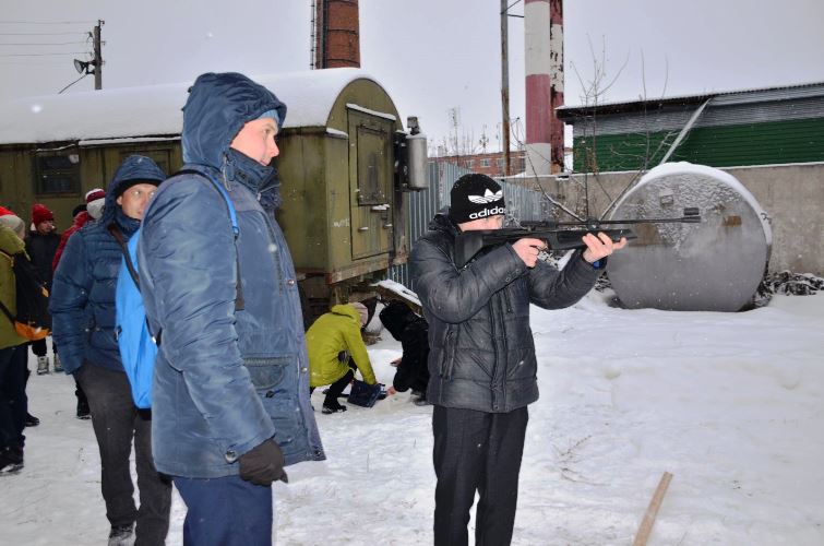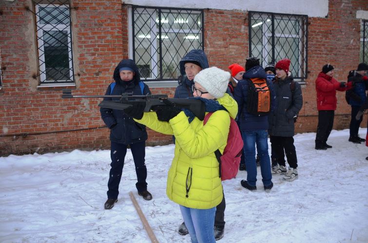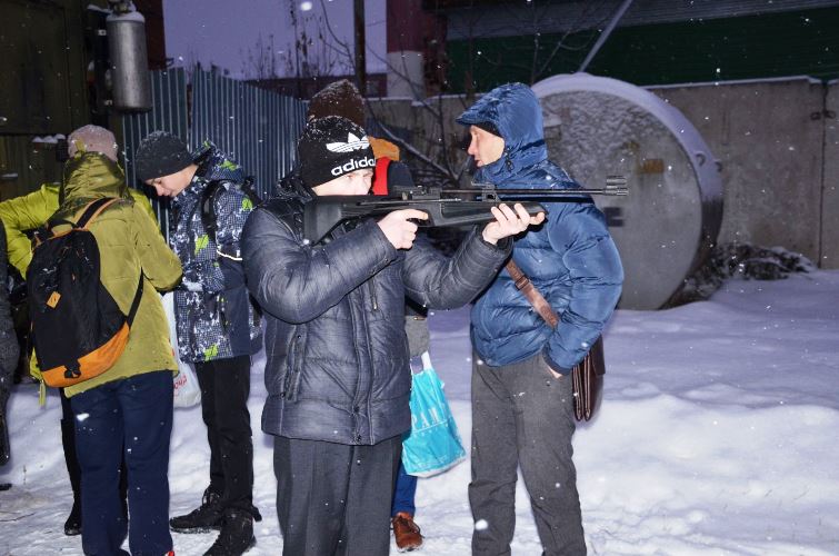 На улице морозно. Ребята волнуются: не часто им приходится держать в руках оружие. Но все же настраиваются на стрельбу.
