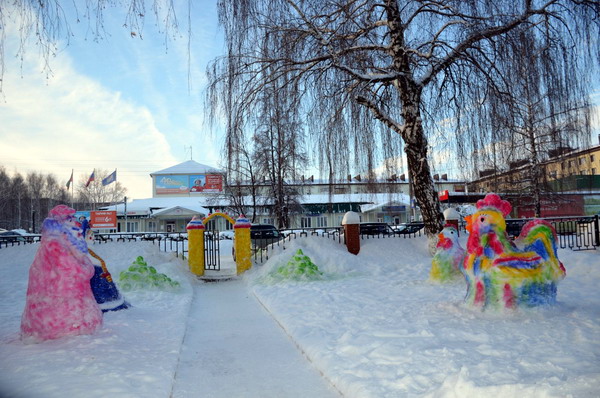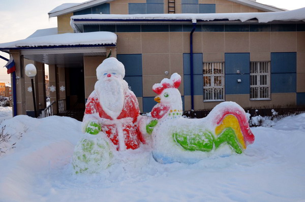 На территории школы искусств уже стоят яркие Дед Мороз и символ наступающего года – Петух. В нескольких местах города функционируют ледяные горки, например, на стадионе.