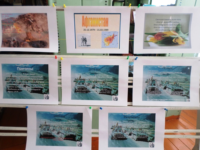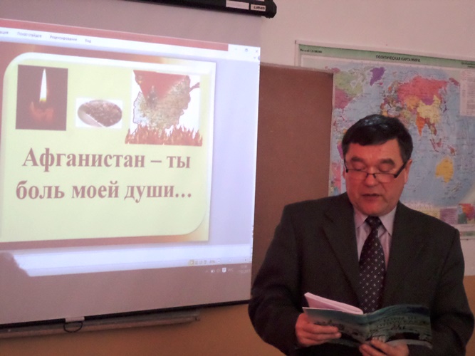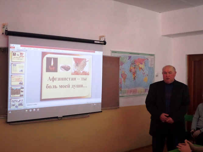 В Бимском СОШ проведен Урок мужества, посвященный воинам-интернационалистам, выполнившим священный долг в Афганской земле. На мероприятие были приглашены участники боевых действий. Организована выставка. Дети читали стихи, были подготовлены видеофрагменты об Афганской войне. Выступил Глава Бимского сельского поселения Шамеев В.В. Вспомнили поименно всех выпускников Бимской школы, участников Афганской войны. Учитель ОБЖ провел презентацию книги "Горы не отпускают", об Агрызцах, выполнивших военный долг на земле Афганистана. В конце мероприятия минутой молчания почтили память погибших солдат.