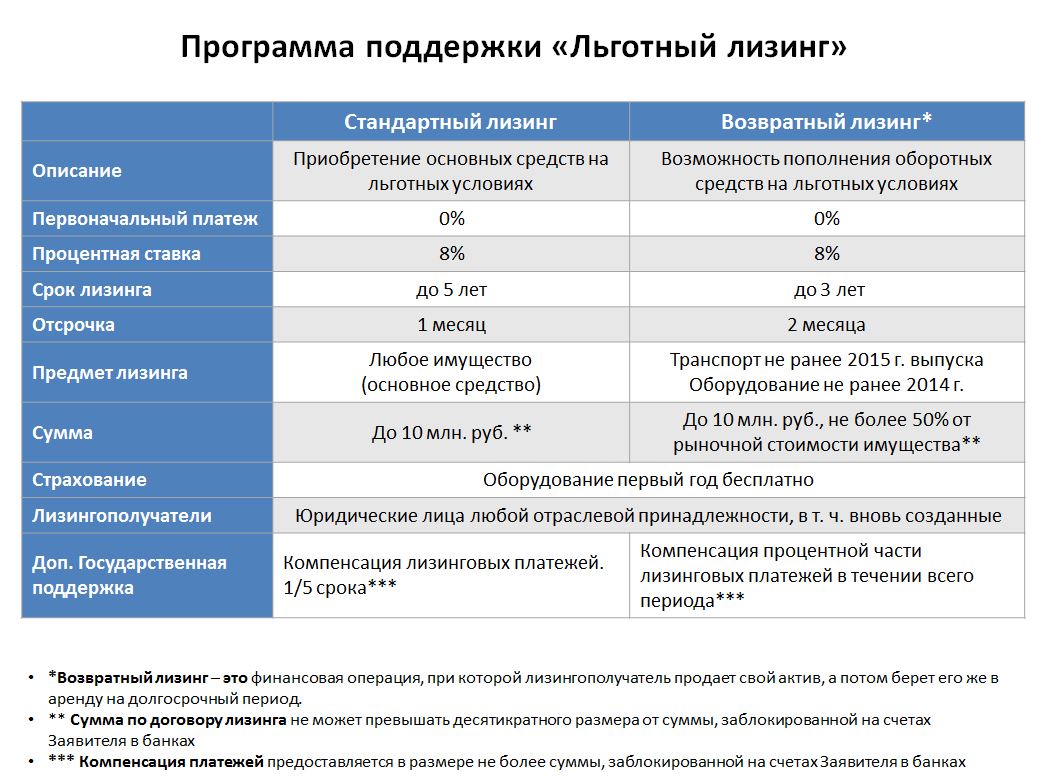 Также программа льготного лизинга предполагает возможность получения финансирования денежными средствами при помощи механизма обратного лизинга. В данном случае компенсируется процентная часть лизинговых платежей в течение всего срока действия договора лизинга.