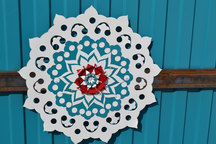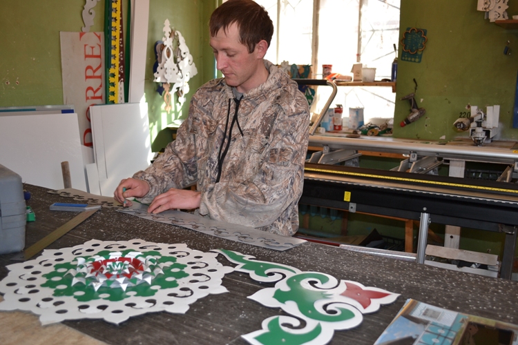 В комнате бывшей АТС сегодня кипит работа. Шамиль здесь режет профнастил, изготавливает узоры. Умельцы купили и станок, разрезающий профнастил. А на готовом листе не стоит особого труда поставить цветочный трафарет и разрезать ножницами.