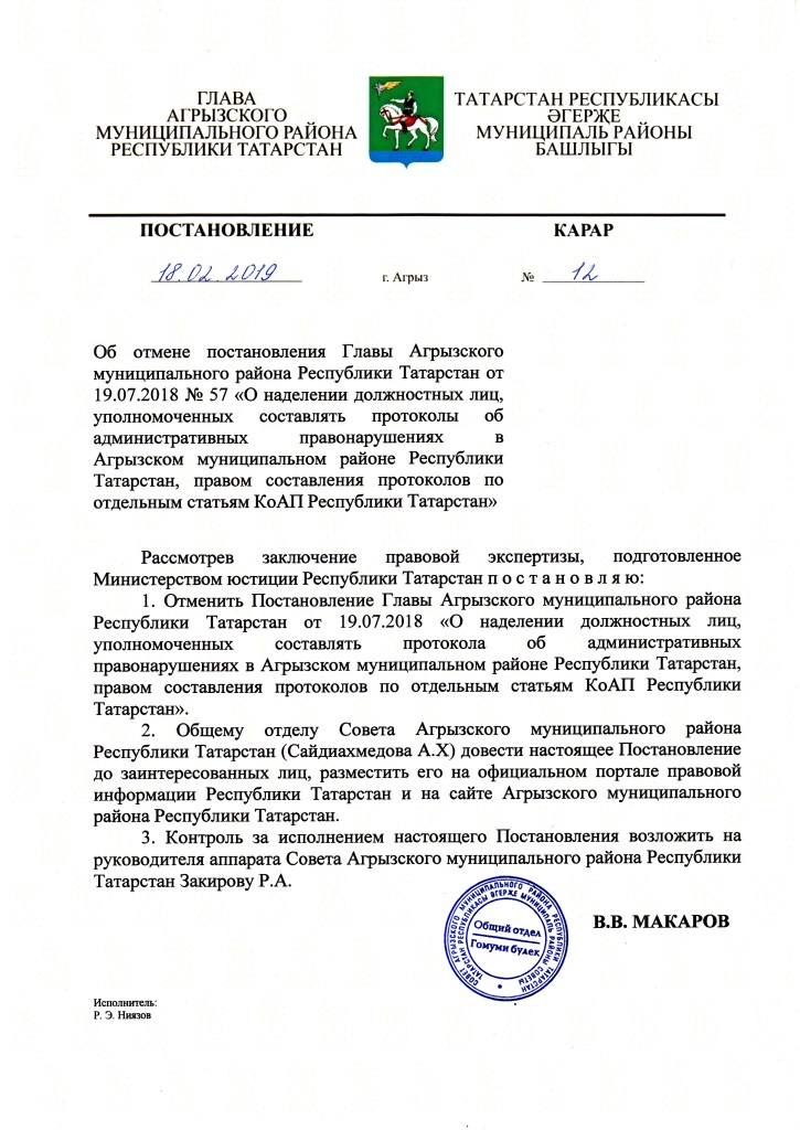 №12 от 18.02.2019 "Об отмене постановления Главы Агрызского муниципального района Республики Татарстан от 19.07.2018 № 57 «О наделении должностных лиц, уполномоченных составлять протоколы об административных правонарушениях в Агрызском муниципальном районе Республики Татарстан, правом составления протоколов по отдельным статьям КоАП Республики Татарстан»