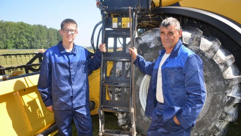 Рәсемдә: “Исәнбай“ бүлекчәсе комбайнчысы Вячеслав Пастухов ярдәмчесе Илназ Сизов белән.
