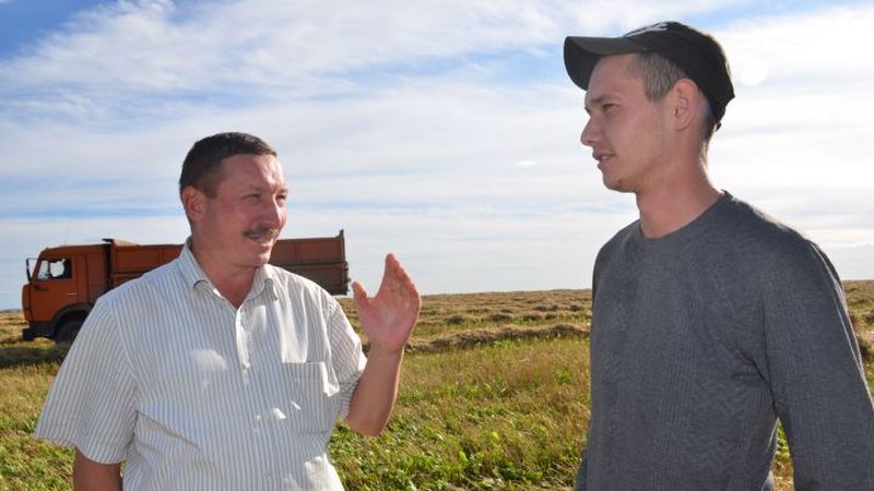 Рәсемдә: район авыл хуҗалыгы идарәсе начальнигы Дилүс Гатауллин һәм алдынгы комбайнчы Нияз Хуҗин.