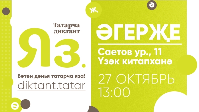 27 октябрьдә 13:00 сәгатьтә бөтен дөнья буенча «Татарча диктант» белем бирү акциясе узачак. Әгерҗедә "Татарча диктант" Үзәк китапханәдә узачак.