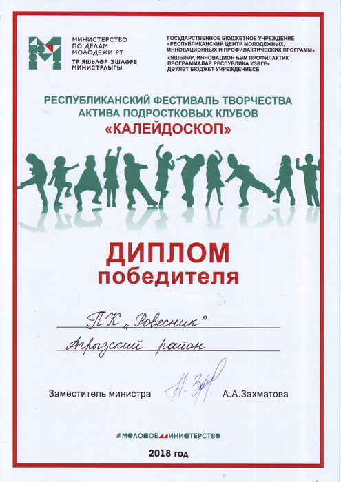 "Ровесник" яшүсмерләр клубы "Калейдоскоп" яшүсмерләр клублары активының республика фестивалендә җиңүче булды.