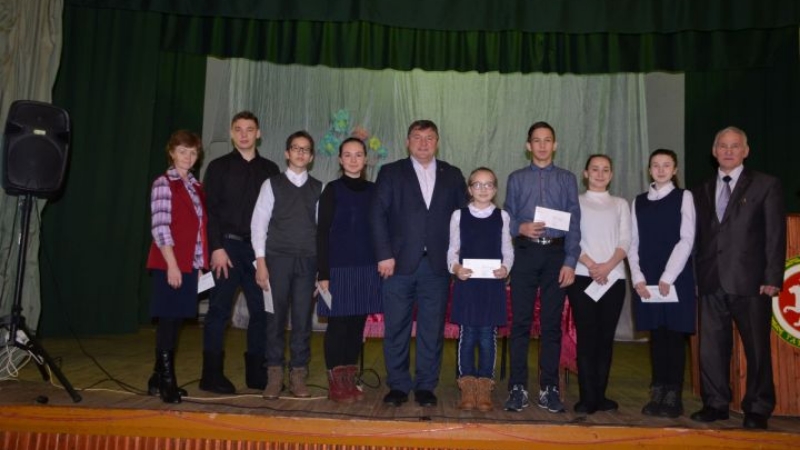 Кадыбашта үткән җыенда уку алдынгысы булган, төрле бәйге, олимпиадаларда җиңү яулаган бер төркем укучылар сәхнәгә күтәрелделәр.