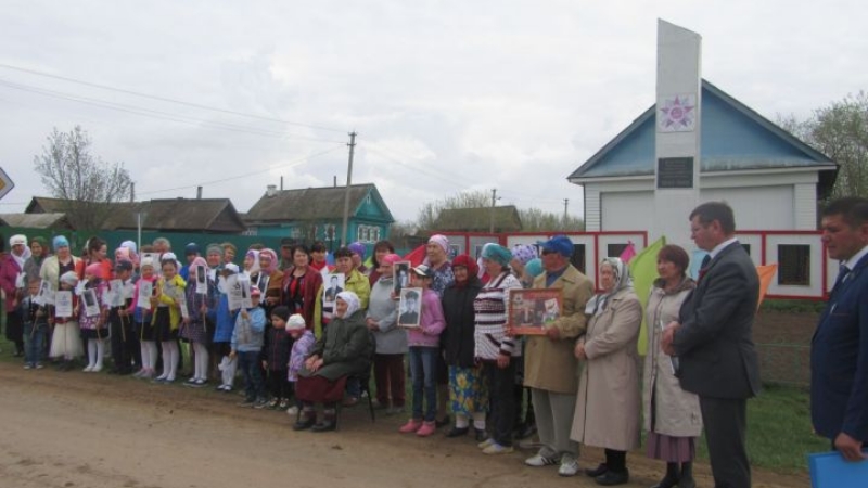 Авыл халкын олы бәйрәм белән район башлыгы Валерий Макаров исеменнән аның урынбасары Ришат Нурисламов тәбрикләде. Авыл җирлеге башлыгы Илдус Гафаров та үтәгәнлеләргә имин тормыш, сәламәтлек теләде. Сугышта катнашкан батырларны бер минут тынлык белән искә алдылар. Мәктәп укучылары, авыл халкы “Үлемсез полк“ акциясенә дә бик теләп кушылды. Сугышта һәлак булган батырлар хөрмәтенә куелган обелискка веноклар салынды.