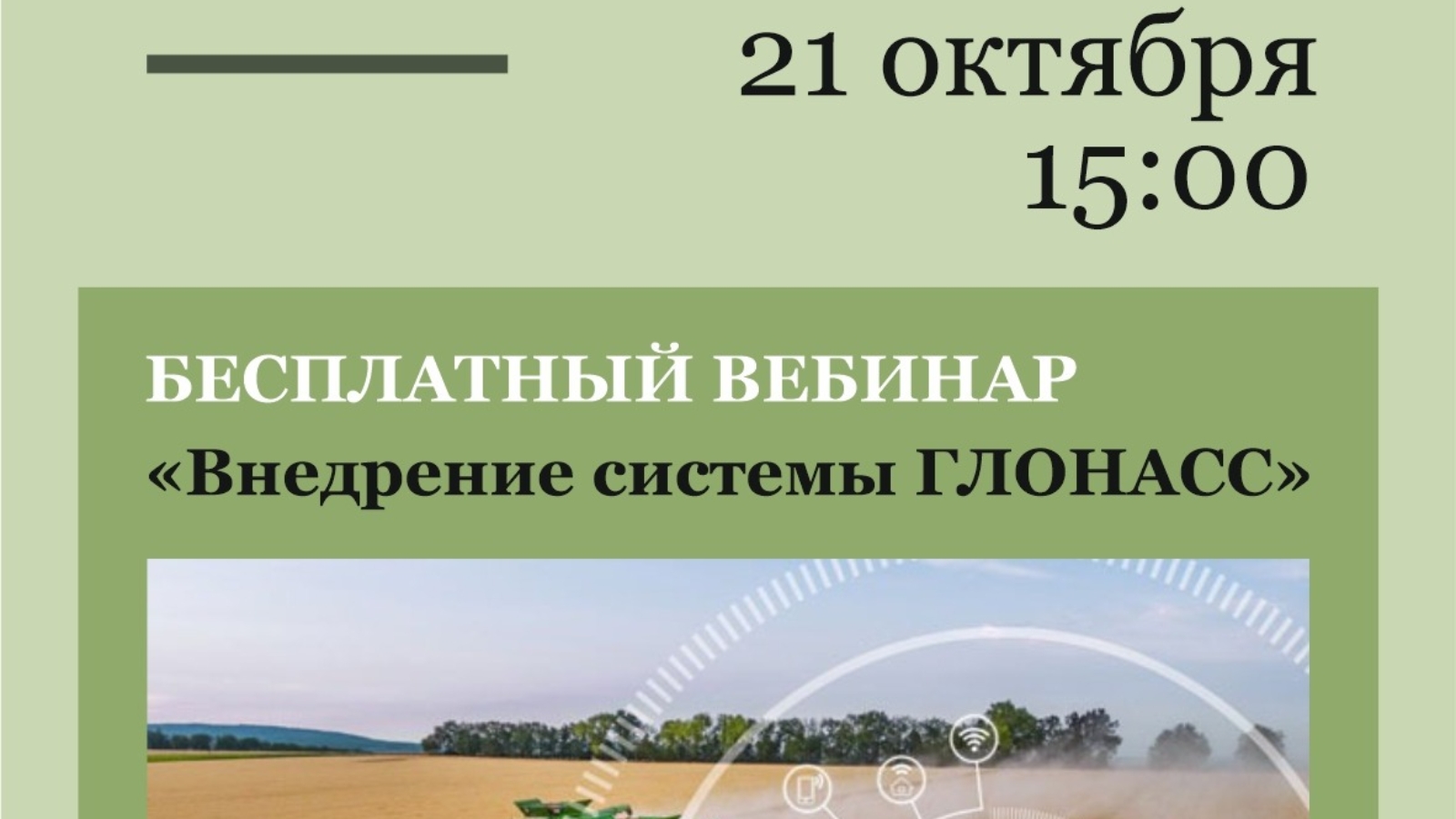 21 октябрьдә 13:00 сәгатьтә «Агрополия» онлайн мәктәбе кысаларында чираттагы бушлай вебинар узачак. Ул "Глонасс" системасын кертүгә багышлана. Уку барышында "Глонасс" системасын кертү буенча "Евротехнологияләр" компаниясенең әйдәп баручы белгече Илья Щулекин системаны гамәлгә кертү авыл хуҗалыгы продукциясен җитештерүнең нәтиҗәлелеген арттырырга мөмкинлек бирүе, шулай ук ягулык-майлау материалларына чыгымнарны 20% ка кадәр киметү өчен GPS трекер куллану турында сөйлиячәк.