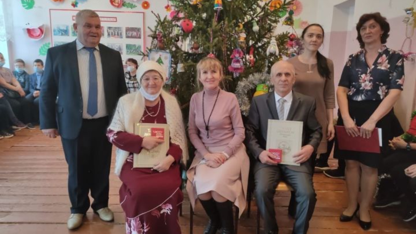 Район мәгариф идарәсе җитәкчесе Вәсилә Сафиуллина Салагыш һәм Исәнбай авыллары мәгариф ветераннары Лидия Мәҗитова һәм Ринат Борһаниевка “ТАССРның 100 еллыгы” истәлек билгеләрен тапшырды.