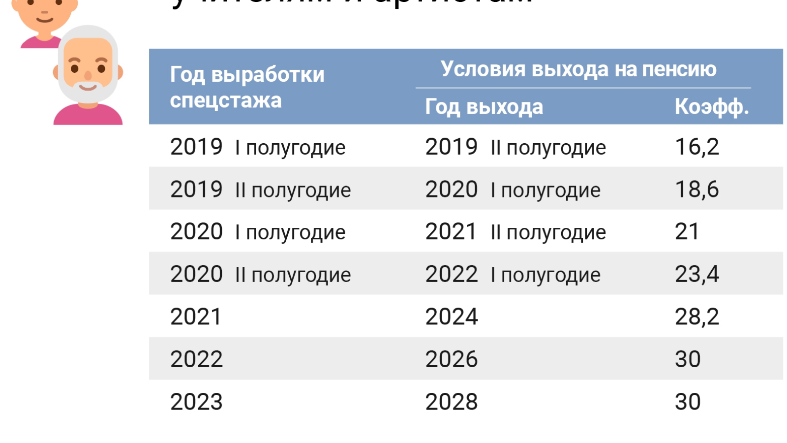 Шуның белән бергә, 2019 елдан башлап санап үтелгән һөнәр хезмәткәрләренең пенсиягә чыгу пенсия яшен арттыру буенча күчеш чорын исәпкә алып билгеләнә. Аның нигезендә табибларга, укытучыларга һәм артистларга пенсияне билгеләү акрынлап махсус стаж эшләп чыгарган мизгелдән күчерелә. Шул ук вакытта алар кирәкле хезмәтләр сатып алганнан соң хезмәт эшчәнлеген дәвам итәргә яки эшне туктатырга мөмкин.