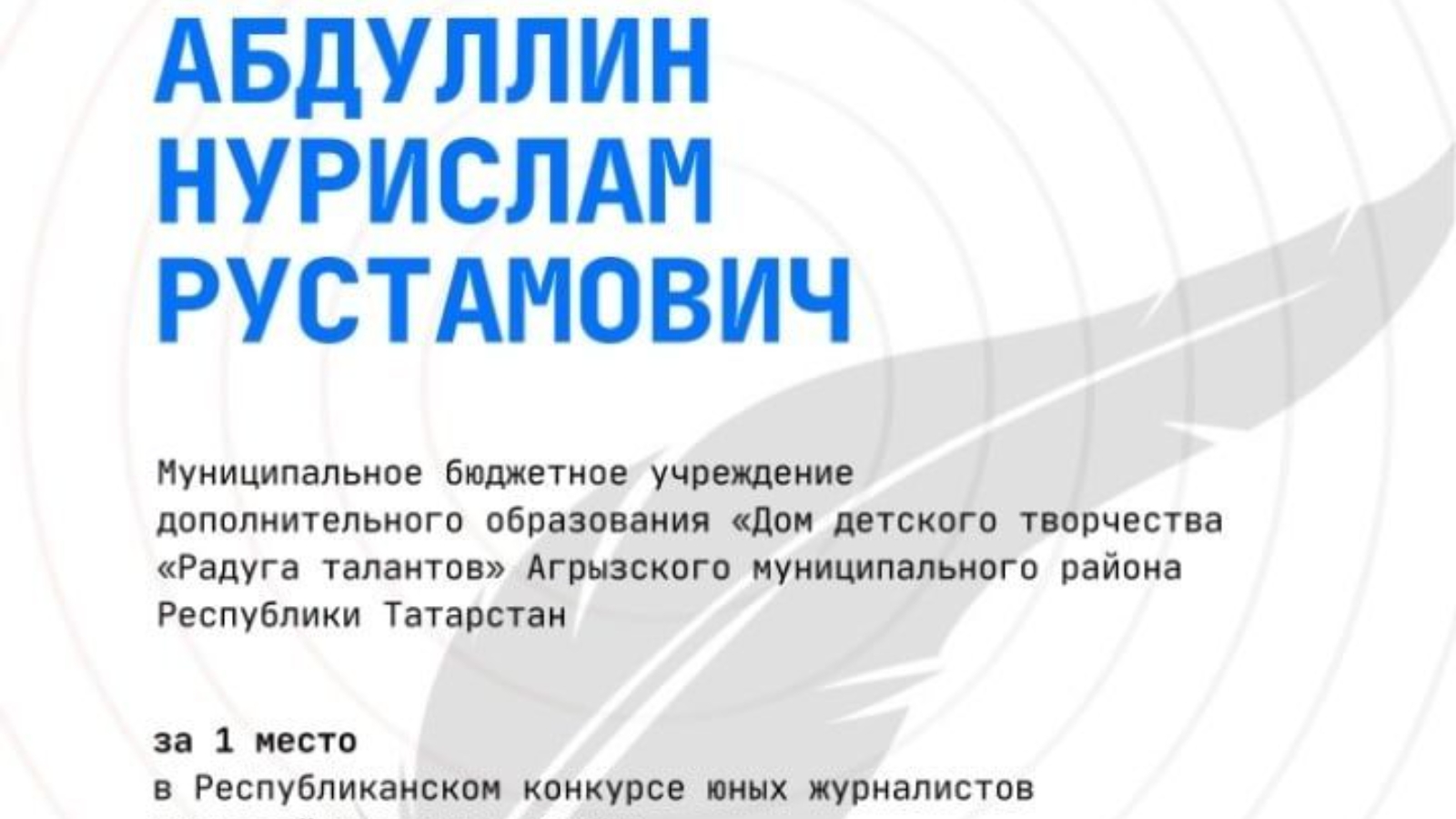 Тирсә мәктәбенең 4 б сыйныф укучысы Абдуллин Нурислам "ТАССРның 100 еллыгы" номинациясендә "Яшь журналист-2020" яшь журналистларының Республика конкурсында, "телевидение" юнәлешендә катнашты һәм республикада беренче урынны яулады!