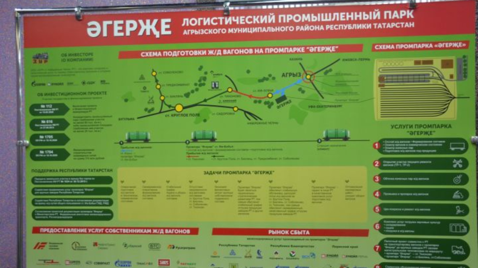 Әгерҗе шәһәрендә логистик сәнәгать паркын төзү проекты турында «ЗУР» ҖЧҖ директоры Марат Шәфигуллин сөйләде. Инде хәбәр итүебезчә, инвестор тимер юл вагоннарын эшкәртүне, тимер юл составларын формалаштыруны, вагоннарны карауны һәм әзерләүне, аларның артта калуын күздә тота. Сәнәгать мәйданчыгы хезмәтләренә Татарстанның эре сәнәгать предприятиеләре (ТАНЕКО, ТАИФ, Түбән Кама нефть химиясе, Менделеевсказот), шулай ук күрше регионнар предприятиеләре тарафыннан ихтыяҗ булачак.