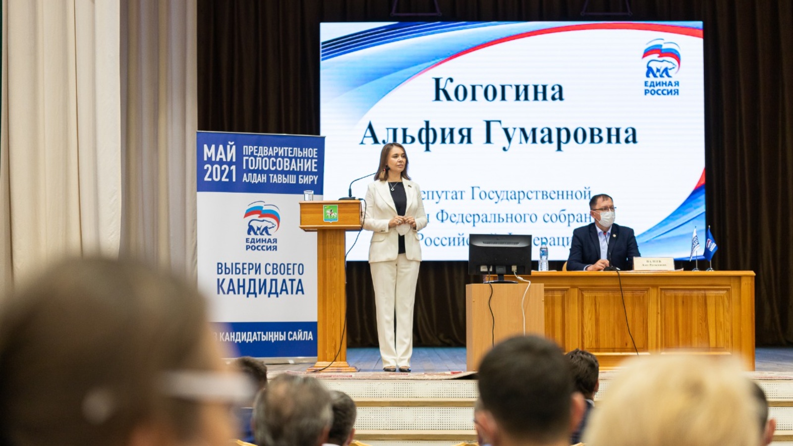 Дәүләт Думасы депутаты, Икътисади сәясәт, сәнәгать, инновацион үсеш һәм эшкуарлык комитеты рәисе урынбасары Әлфия Когогина Татарстан Республикасы Әгерҗе шәһәрендә "Бердәм Россия" нең беренчел тавыш бирүдә катнашучылар очрашуында катнашты.