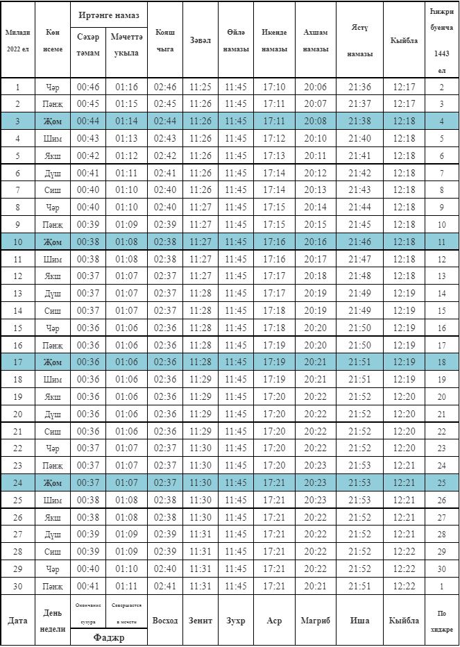 ИЮНЬ (ЗӨЛКАГЪДӘ-ЗӨЛХИҖҖӘ) аена намаз вакытлары