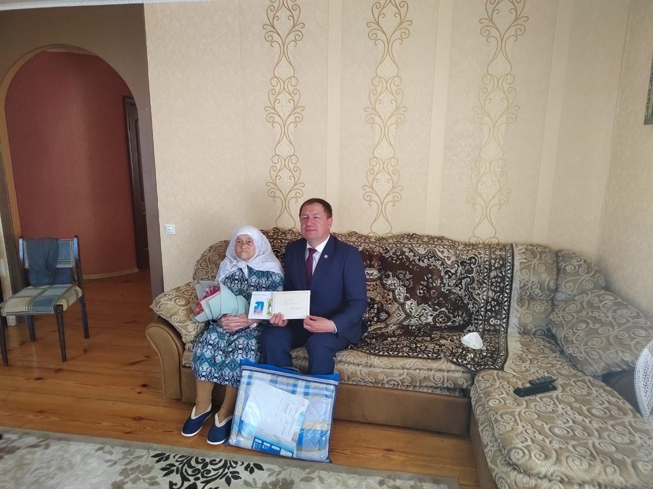 Ул юбилярны олуг билее белән котлап, иң изге теләкләрен ирештерде, бүләк тапшырды. Азат Рөстәм улы Россия Президенты Владимир Путинның, Татарстан Президенты Рөстәм Миңнехановның котлауларын да ирештерде.