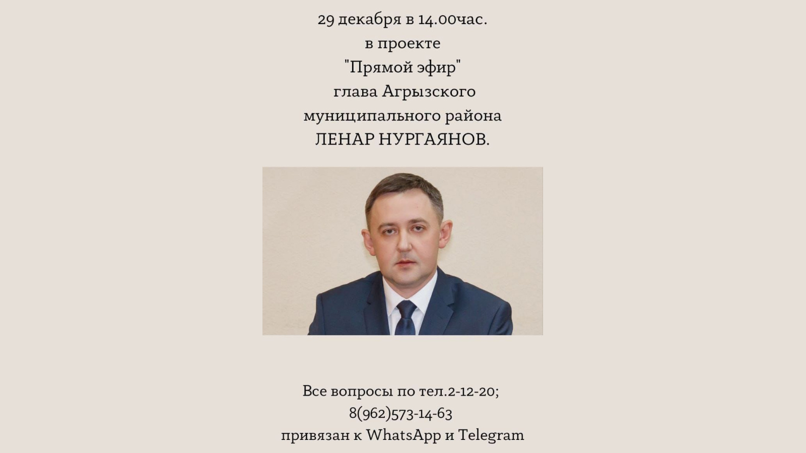 29 декабрьдә 14:00 сәгатьтә Әгерҗе муниципаль районы башлыгы Ленар Фәрид улы Нургаянов белән туры эфир узачак.