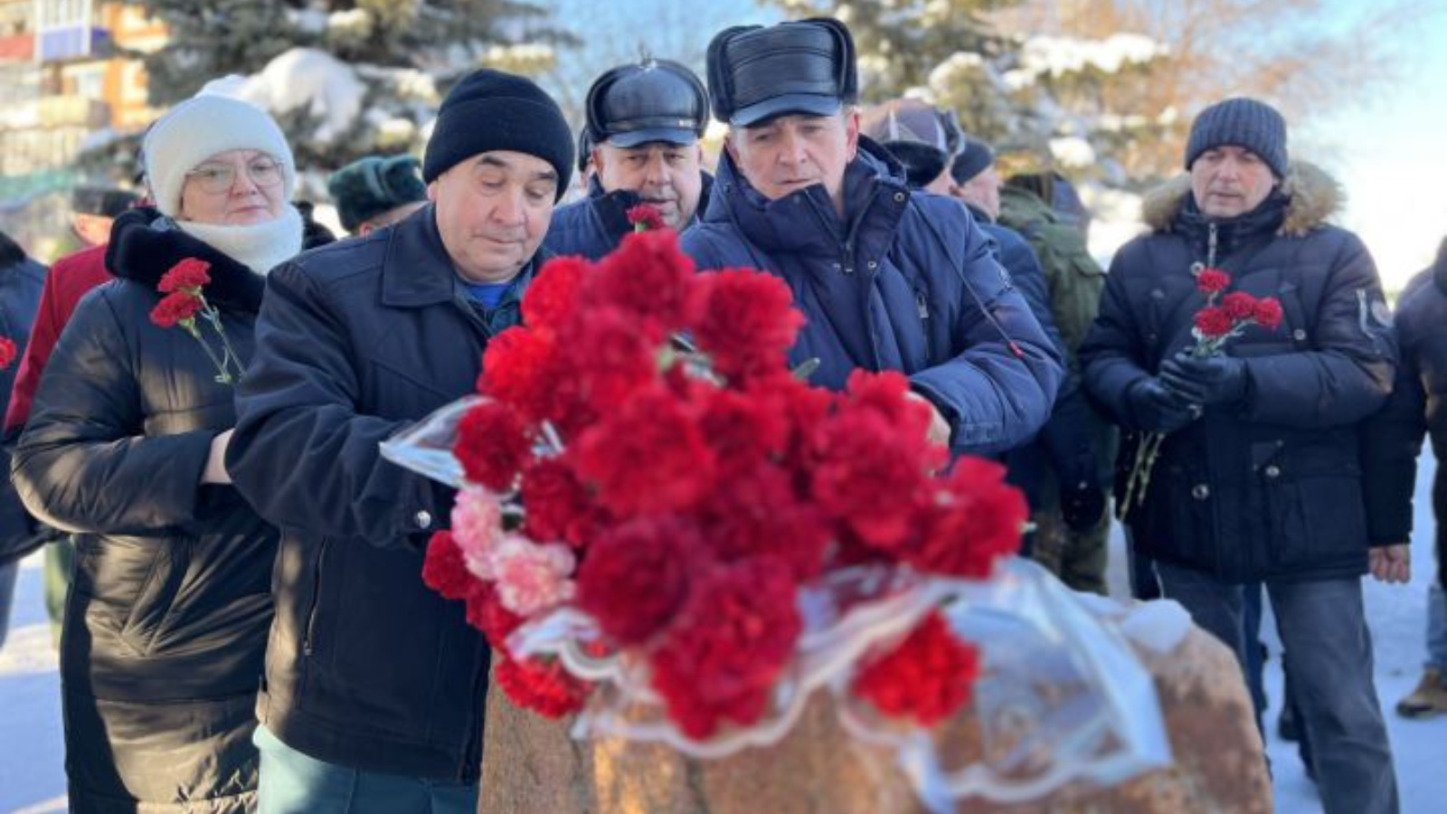 Җыелганнар сугышчан иптәшләрен бер минутлык тынлык белән искә алдылар һәм сугышчы-интернационалистларга куелган һәйкәлгә кызыл канәферләр салдылар.