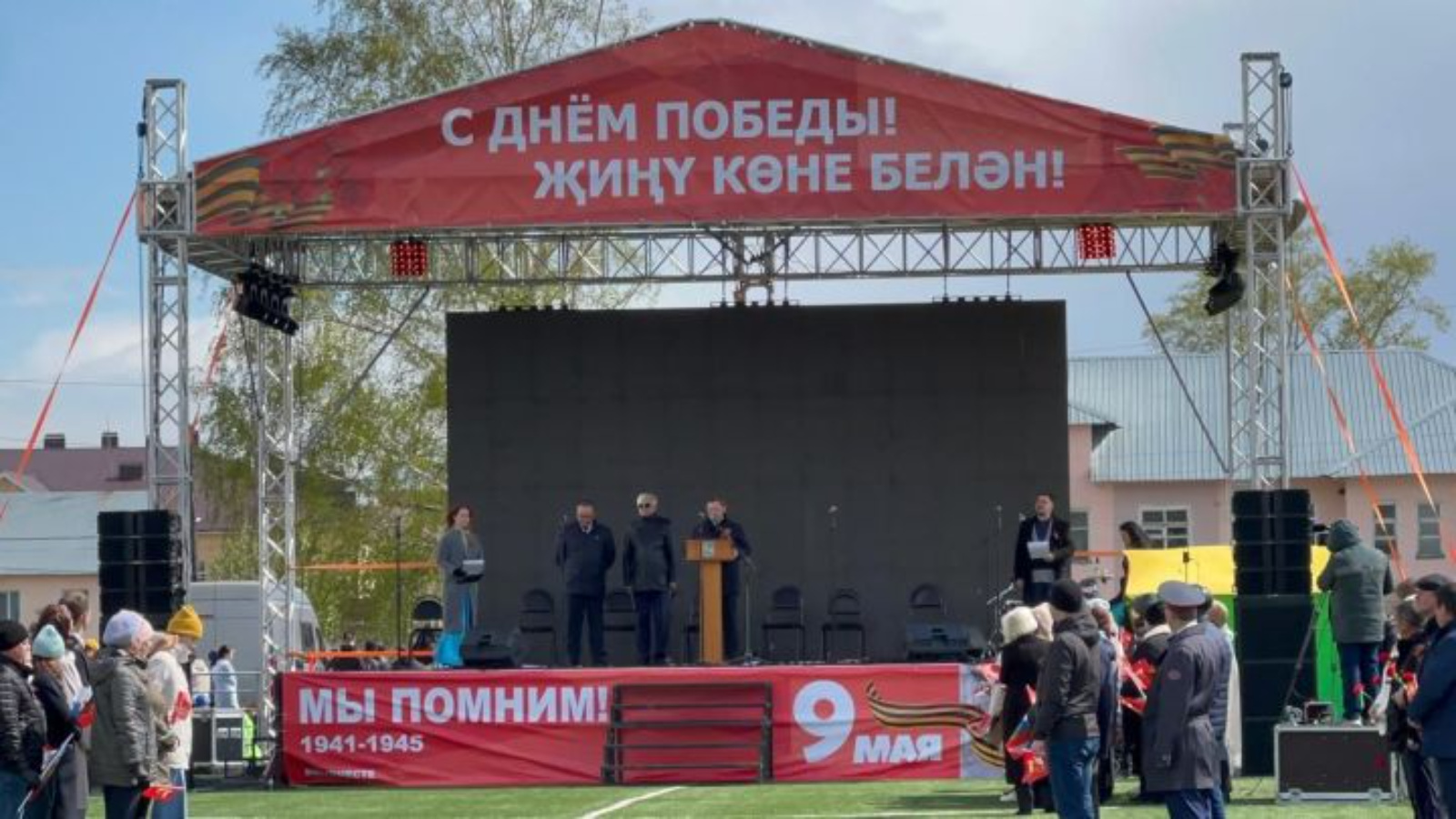 «Хөрмәтле Бөек Ватан сугышы ветераннары, тыл хезмәтчәннәре, тол хатыннар, сугыш балалары. Хөрмәтле әгерҗелеләр һәм бәйрәм кунаклары! 9 май - һәр россияле өчен изге дата. Бу көнне без күз яшьләре белән бәйрәм дип атыйбыз, чөнки Ватаныбызның азатлыгы һәм бәйсезлеге өчен гомерен биргән кешеләрне искә төшерәбез. Районның 14 меңнән артык гражданы Бөек Ватан сугышы фронтына киткән, 4500дән артык кеше һәлак булган, 5 мең кеше хәбәрсез югалган.