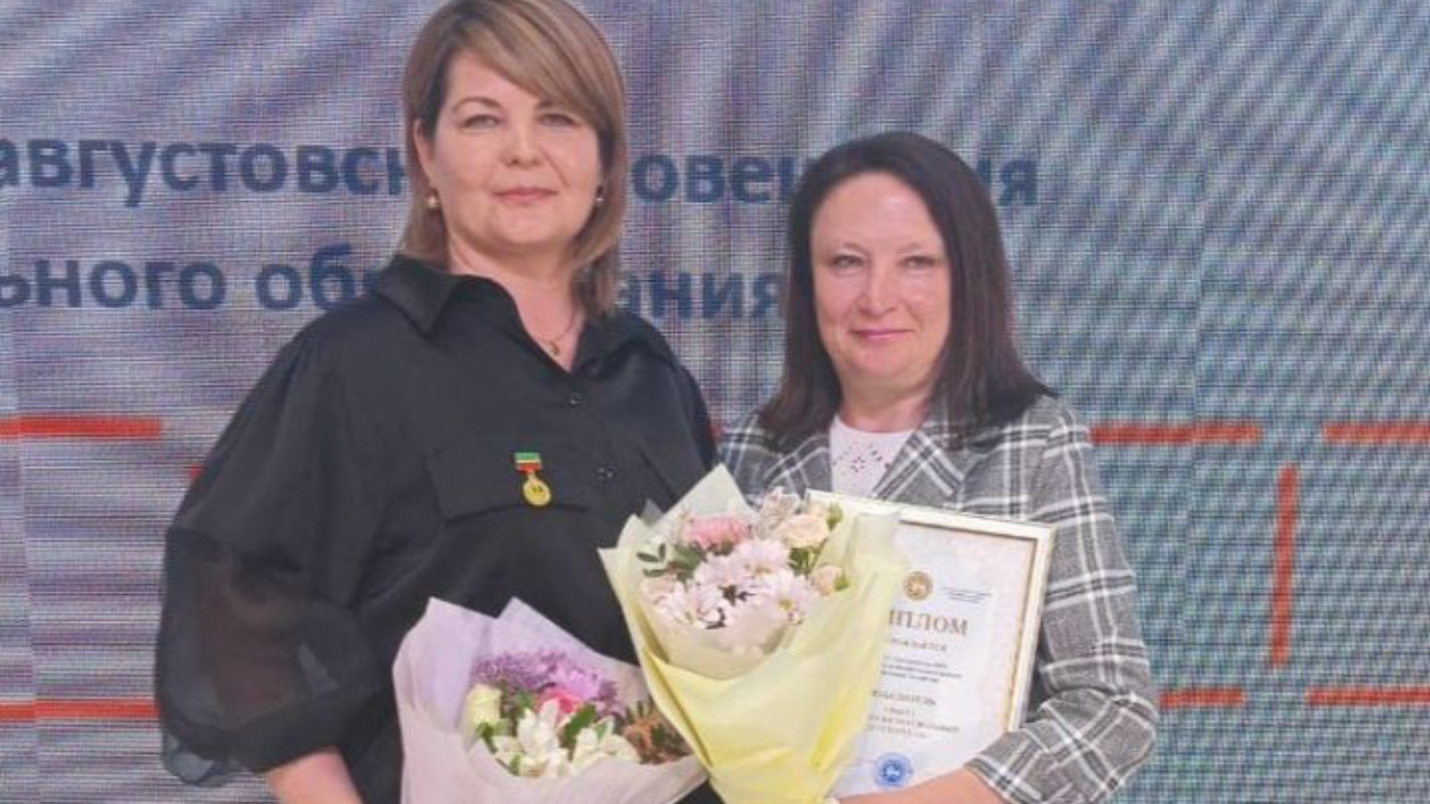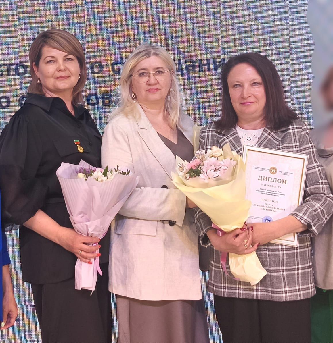 Әгерҗе районы мәгариф идарәсе методисты Кәлимуллина Ләйсән "Мәгарифтә казанышлары өчен" күкрәк билгесе, 9 нчы Красноперова балалар бакчасы мөдире Наталья диплом белән бүләкләнде.