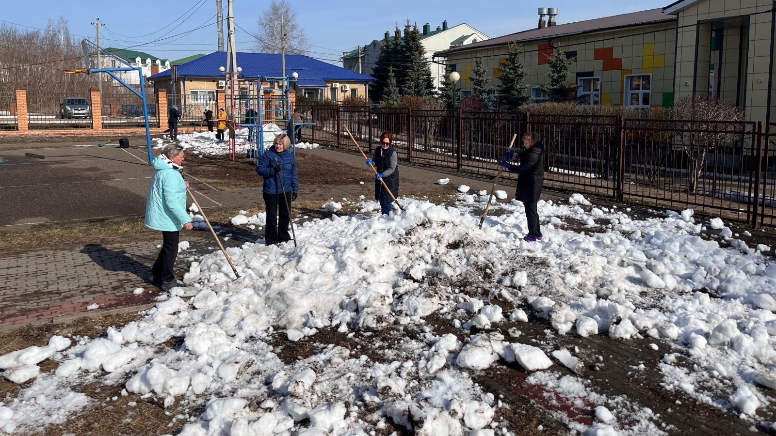 Эш коралларын: көрәкләр, мётллар һәм тырмалар сүтеп, территорияне чистарту эшләрен башкардылар: кар тараттылар, коелган яфракларны алдылар, янәшәдәге территориядә юлларны тәртипкә китерделәр.