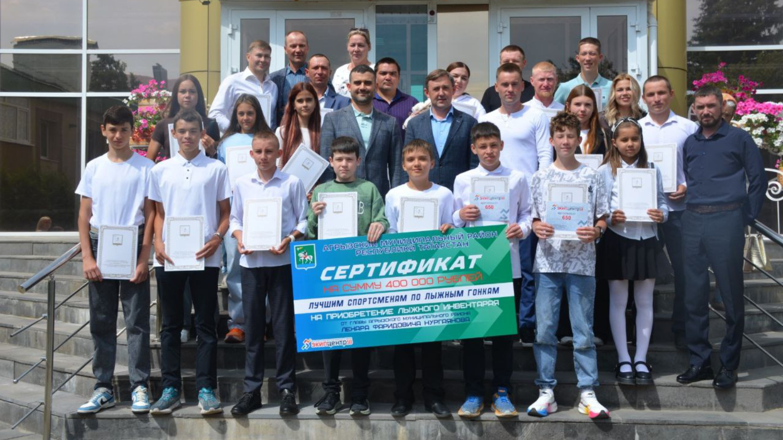 ⚡Лыжникларга Әгерҗе районы башлыгы Ленар Нургаяновтан спорт җиһазлары алу өчен 400 000 сумлык бүләк сертификаты тапшырылды!