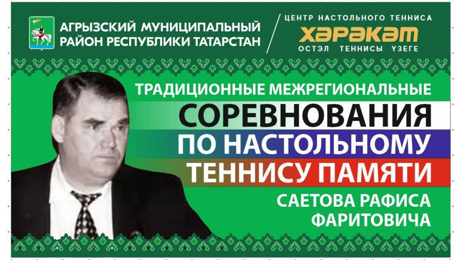 Өстәл теннисы буенча төбәкара ярышларны ТР атказанган авыл хуҗалыгы хезмәткәре, Әгерҗе районы администрациясенең элеккеге башлыгы, район халык депутатлары советы рәисе Сәетов Рәфис Фәрит улы "Хәрәкәт" өстәл теннисы үзәгендә 29 июньдә узачакмын.