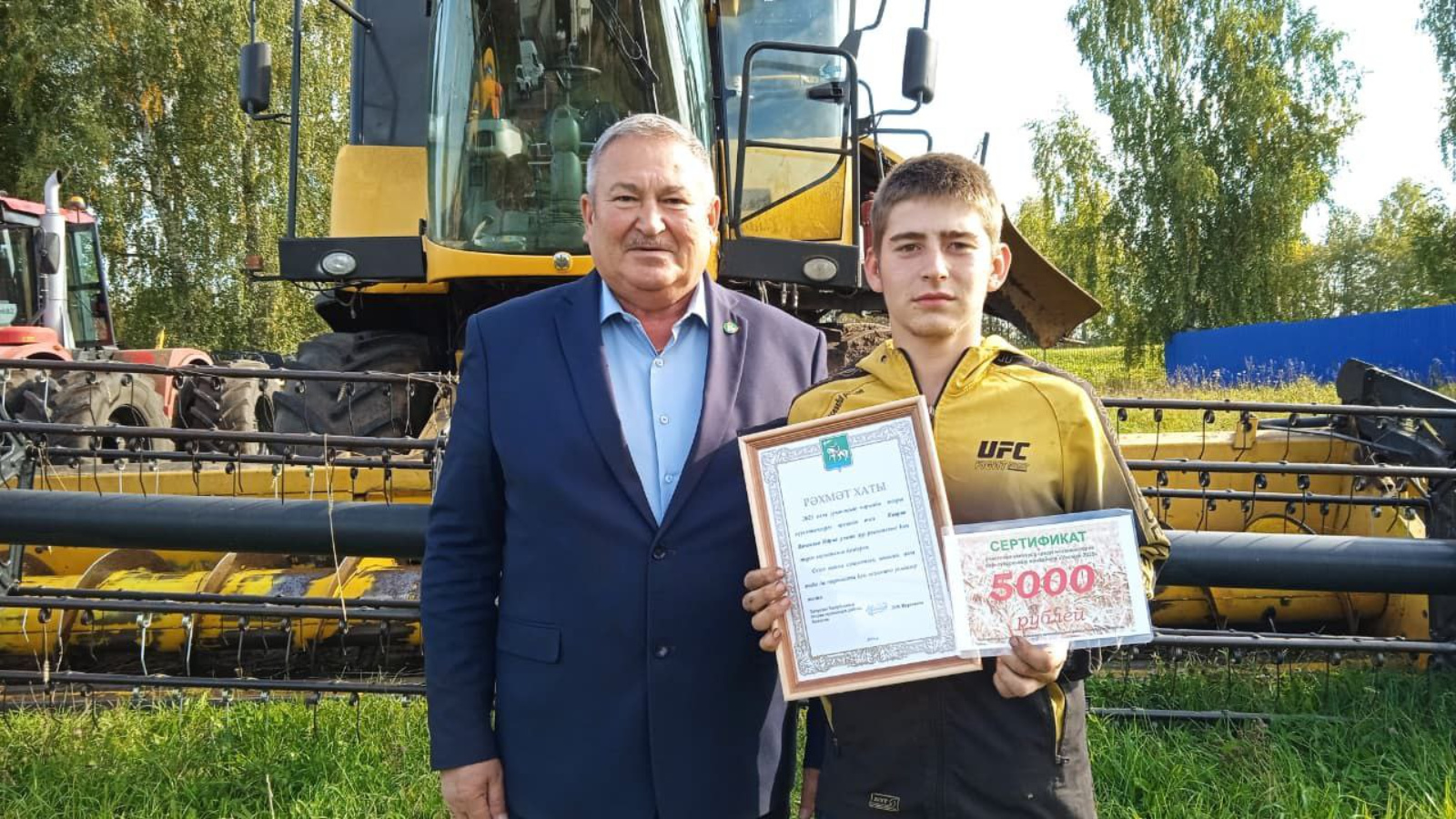 Мех комбайнчы механизаторларга рәхмәт белдерергә кырларга район башлыгы урынбасары Илфат Ямалиев килде. Котлау сүзләре һәм теләкләр белән бергә ул хезмәтчәннәргә рәхмәт хатлары һәм сертификатлар тапшырды.
