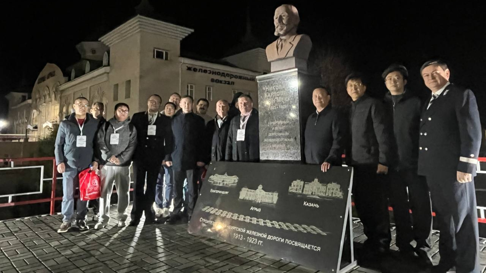 Һәйкәл бу бөек кеше башлап җибәргән узерҗе станциясе аша узучы поездларны символик рәвештә сәламли.