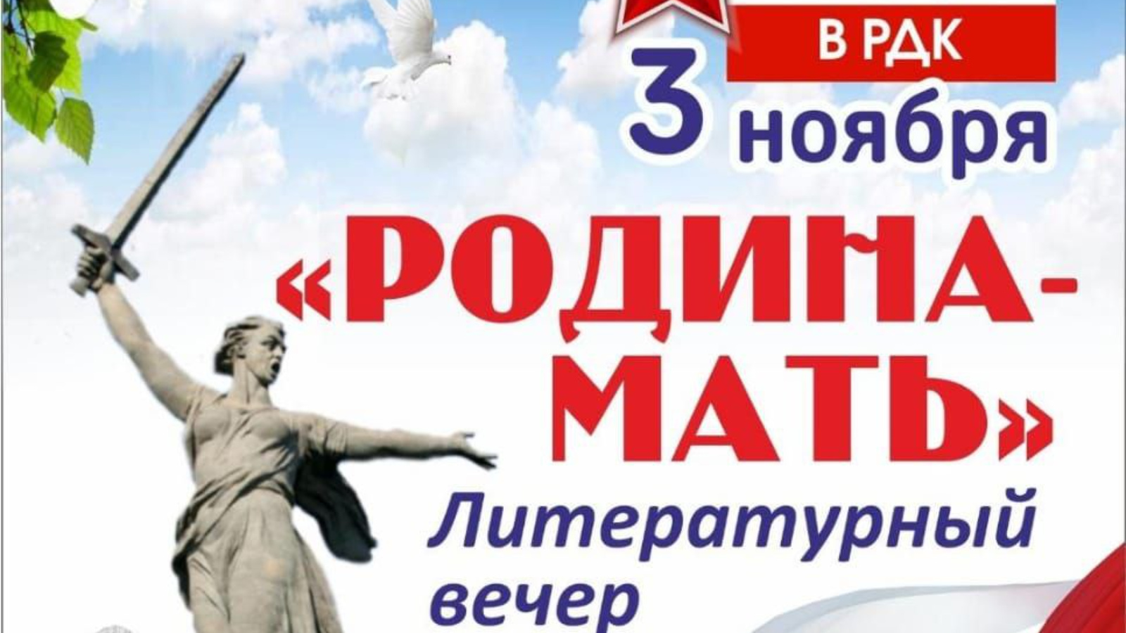 3 ноябрьдә 15.00 сәгатьтә район мәдәният йорты кунакларын «Ватан-Ана чакыра! " скульптурасы турында хикәя көтә.«- Волгоградтагы Мамай курганындагы» Сталинград сугышы геройларына " һәйкәл-ансамбленең композицион үзәге.